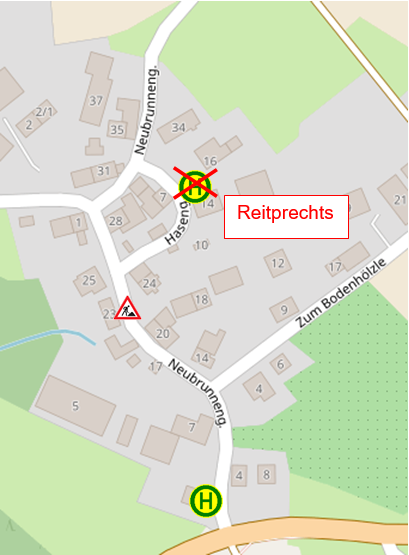 aufgrund einer baubedingten Sperrung in Reitprechts, kann die Haltestelle Reitprechts Hasengasse ab Montag, 02.02.2026 bis auf Weiteres nicht bedient werden. Weitere Informationen zur Dauer der Baumaßnahme liegen uns leider nicht vor, wir bitten um Verständnis.
